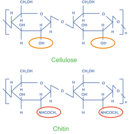 Den biokemiske forskel mellem chitin og cellulose ses af figuren til venstre; Begge bio-polymerer er såkaldte polysakarider eller kulhydrater; men der er forskel i hvilke side-grupper der er på ring-C’erne.