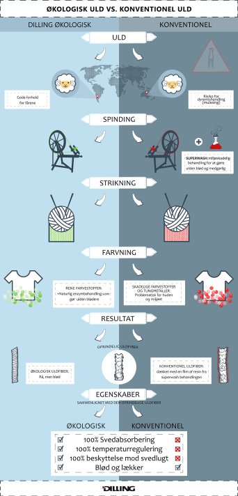 Dilling , dansk producent af økologisk undertøj, har lavet en fin, pædagogisk grafisk fremstilling af princippet for de forskellige behandlinger af uld-fibrene.
