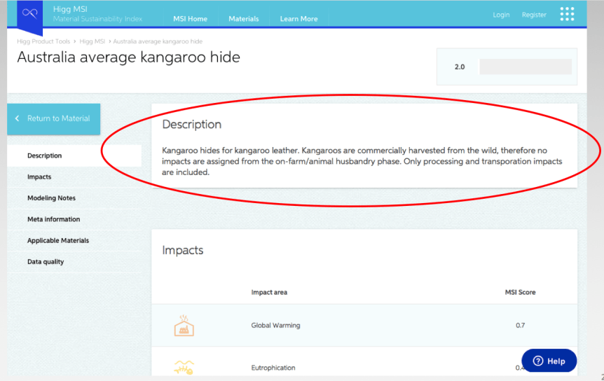 Men, bemærk så lige kænguruen; Læder herfra er, i sammenligning, er en totalt miljøvenlig “duksedreng”. Klikker man lidt ind på dette materiale i MSI, vil det fremgå at grunden til denne virkelig pæne MSI-score skyldes at læderet kommer fra de fritlevende kænguruer i Australien. I kænguro-læderets MSI-score er altså ikke medregnet ressource-bidraget fra industrielt dyrehold.