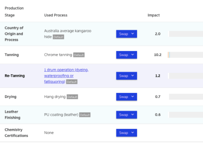 Men, bemærk så lige kænguruen; Læder herfra er, i sammenligning, er en totalt miljøvenlig “duksedreng”. Klikker man lidt ind på dette materiale i MSI, vil det fremgå at grunden til denne virkelig pæne MSI-score skyldes at læderet kommer fra de fritlevende kænguruer i Australien. I kænguro-læderets MSI-score er altså ikke medregnet ressource-bidraget fra industrielt dyrehold.