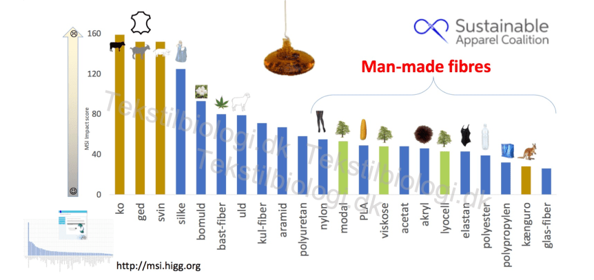 Men, at benytte garn af naturfiber er desværre ikke nogen garanti for miljøvenlighed, måske endda tværtimod… På det meget overordnede plan er tendensen ret klar: Garn af naturfibre er generelt mere miljøbelastende at tilvejebringe end garn af de såkaldt fremstillede fibre, uanset om disse er lavet af biologisk eller syntetisk udgangsmateriale (figur 3).